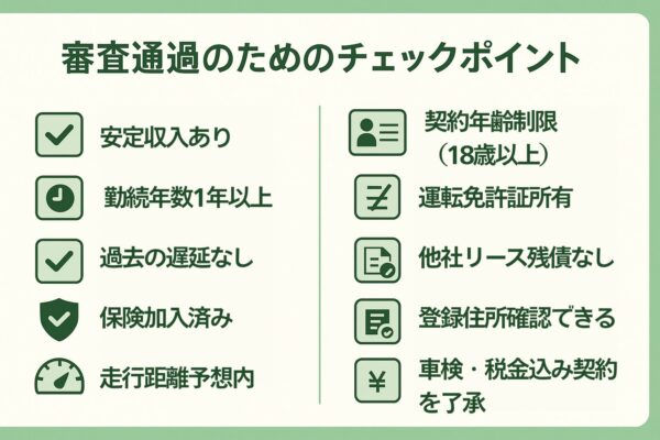 カーリースの審査は、基本的に「契約者の方が、毎月のリース料をきちんと支払い続けられるか」を確認するために行われます。これは、リース会社と契約者、双方にとって大切なことです。
