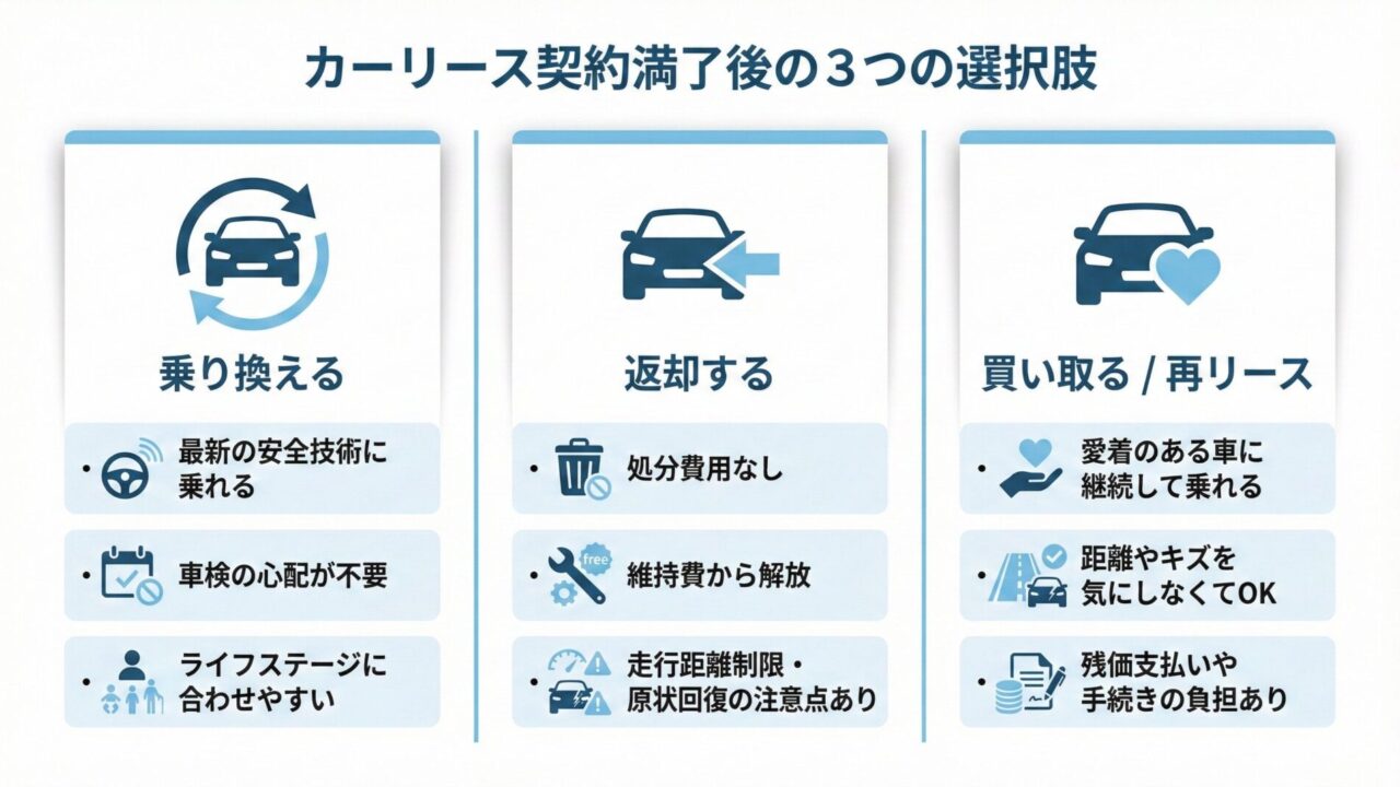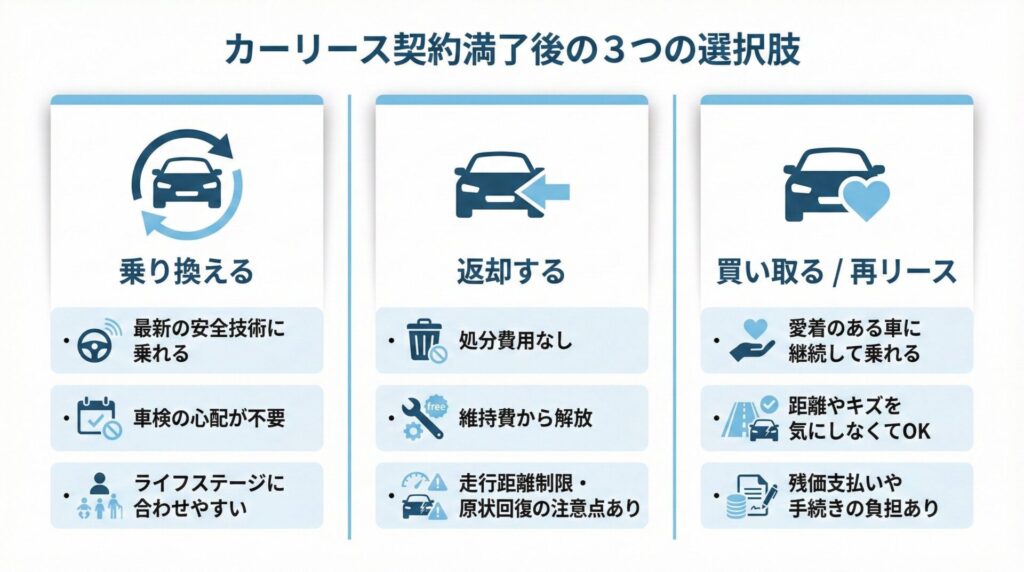 カーリース契約満了時に、あなたには大きく3つの選択肢があります。それぞれの選択肢について、メリット・デメリット、そして長野での暮らしをイメージしながら詳しく見ていきましょう。
