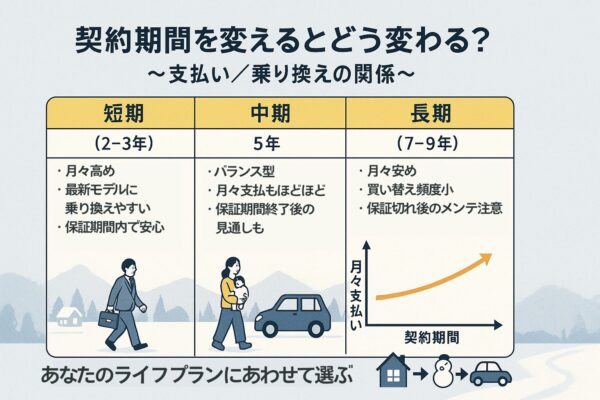 - 「子どもがまだ小さくて、これから家族構成が変わるかもしれないから、数年後に乗り換えたいな」という方は、短期〜中期契約が向いているかもしれません。