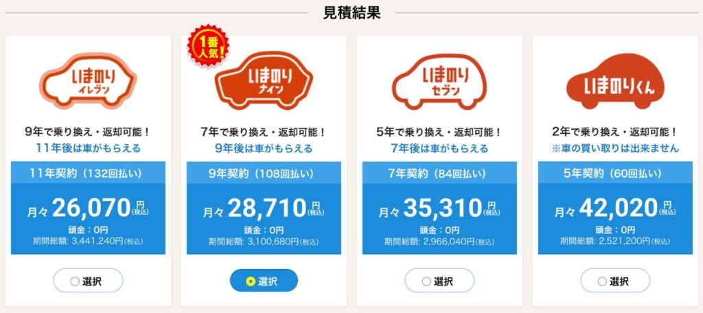 - 契約期間が豊富:1年から最長11年まで、ライフプランに合わせて柔軟に契約期間を選べるのが大きな特徴。「いまのりくん」(5年契約で3年目以降は乗り換え・返却が自由)、「いまのりセブン」(7年契約で5年目以降自由)など、ユニークなプランが充実しています。