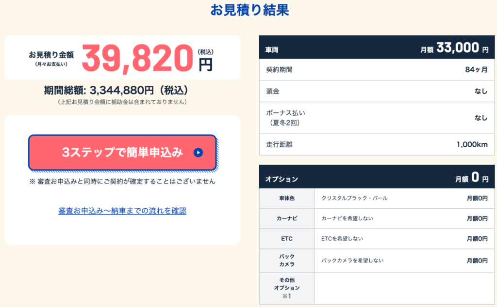 参考車種:トヨタ ヤリス(Xグレード)の場合、7年契約、ボーナス払いなし、メンテナンスパックなしで、月額3万円台後半から利用可能なプランがあります。