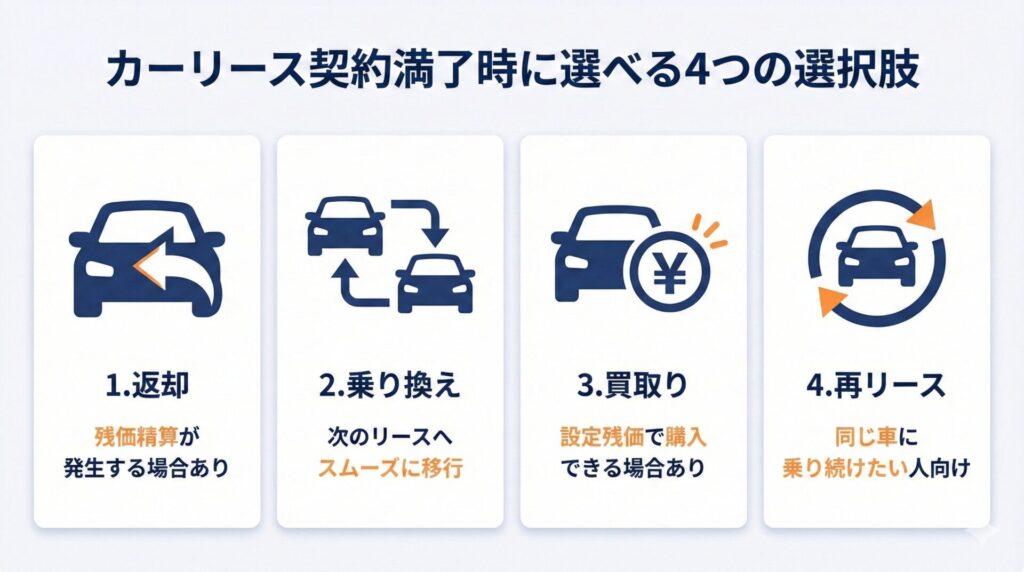 カーリースは契約満了時に「返却」「乗り換え」「再リース」「買取り」など、いくつかの選択肢が用意されています。しかし、会社やプランによって、選べる選択肢や条件が異なります。