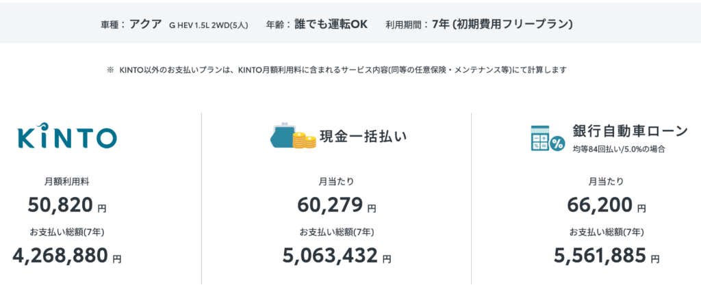 参考車種:トヨタ アクア(Gグレード)の場合、7年契約、初期費用フリープラン、ボーナス払いなしで、月額5万円台前半から利用可能なプランがあります。