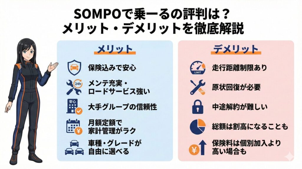 それでは、SOMPOで乗ーるがどのような点で評価され、どのような注意点があるのかを、具体的なメリット・デメリットとしてご紹介します。